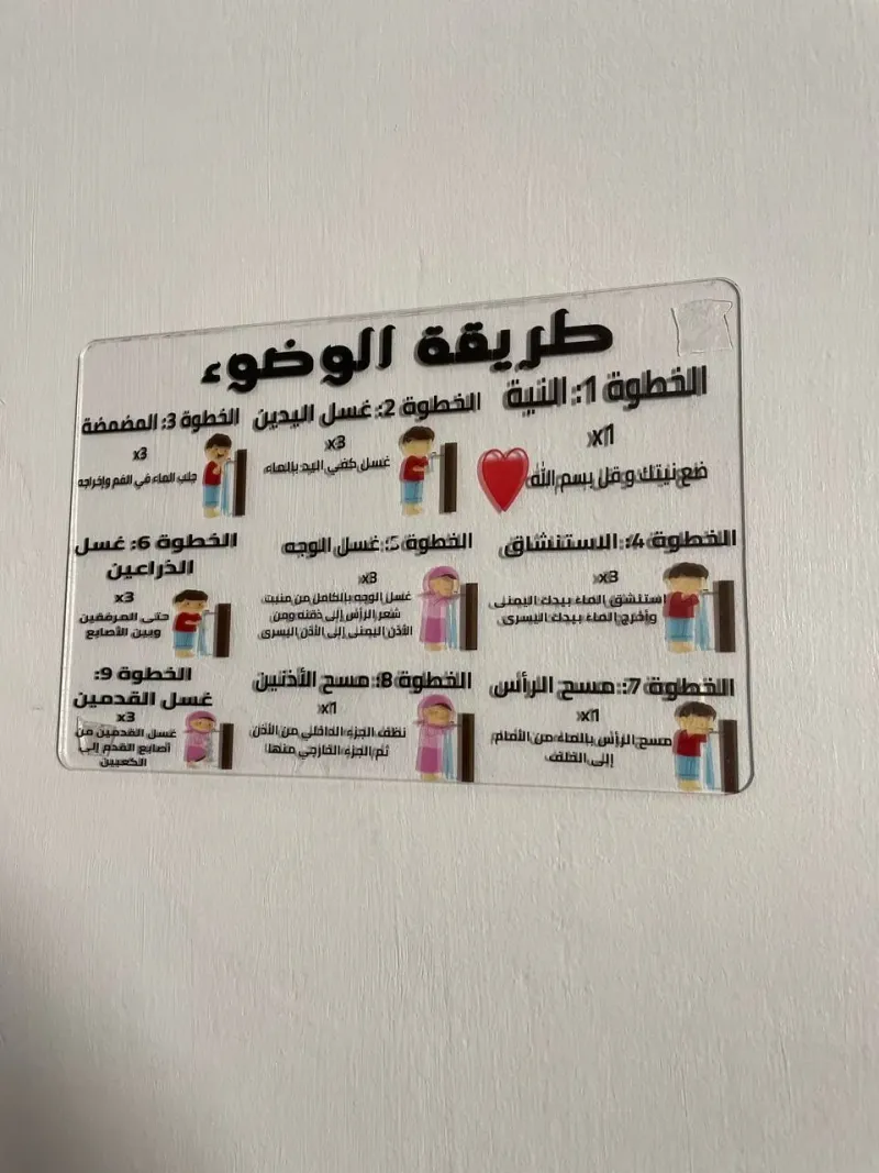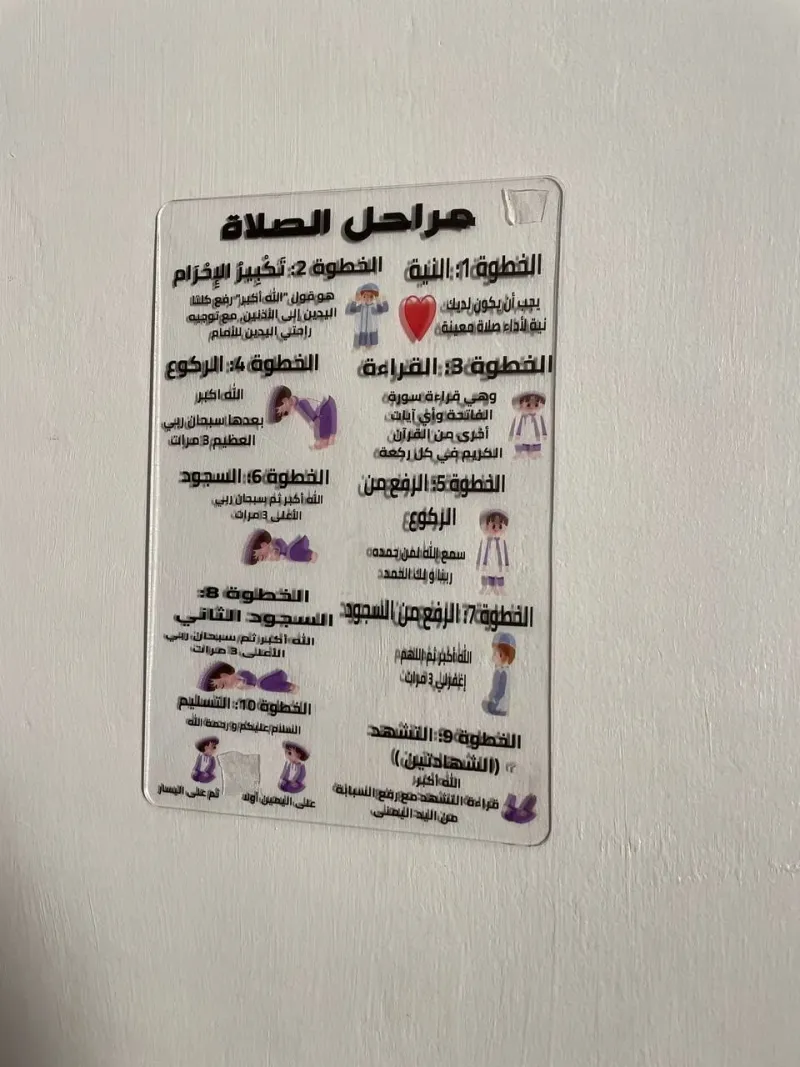 3 لوحات تعليمية أنيقة مصنوعة من بلكسي جلاس الشفاف، مصممة خصيصًا لمساعدة الأطفال والمبتدئين على تعلم خطوات الصلاة الإسلامية بطريقة مبسطة ومرئية. تحتوي اللوحات على رسومات توضيحية لكل خطوة من خطوات الصلاة، كيفية الوضوء، مواقيت الصلاة
